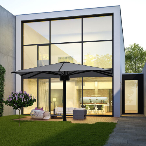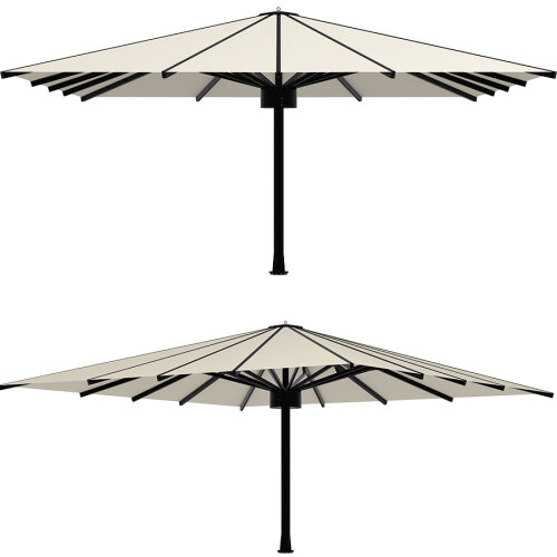 Der selbstarretierende Kurbelantrieb ermöglicht eine wartungsarme Bedienung. Dank des einläufigen Teleskopmechanismus lässt sich der Allwetterschirm bedienen, ohne Mobiliar zu verschieben. Er eignet sich daher perfekt für große Terrassen und Gastronomieobjekte mit intensiver Nutzung.